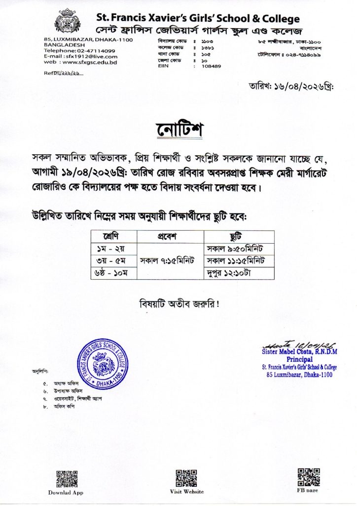 আগামী ১৯/০৪/২০২৬ তারিখ শিক্ষার্থীদের ছুটির সময় সংক্রান্ত জরুরি নোটিশ।